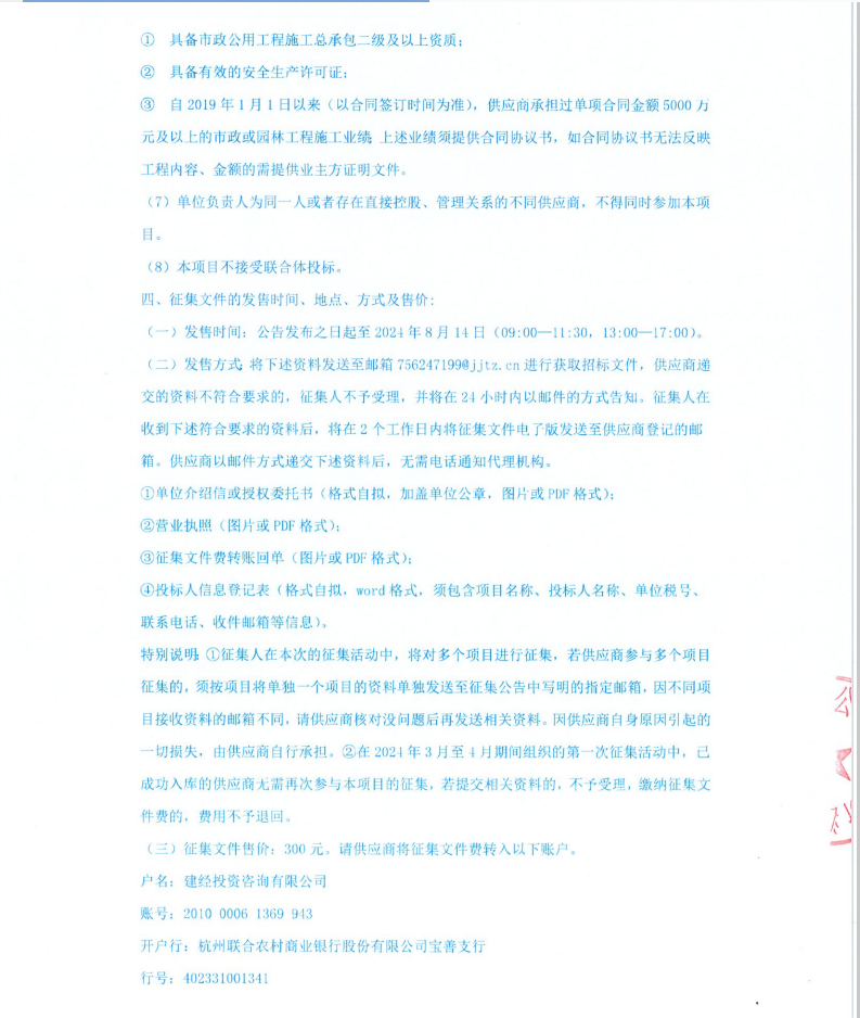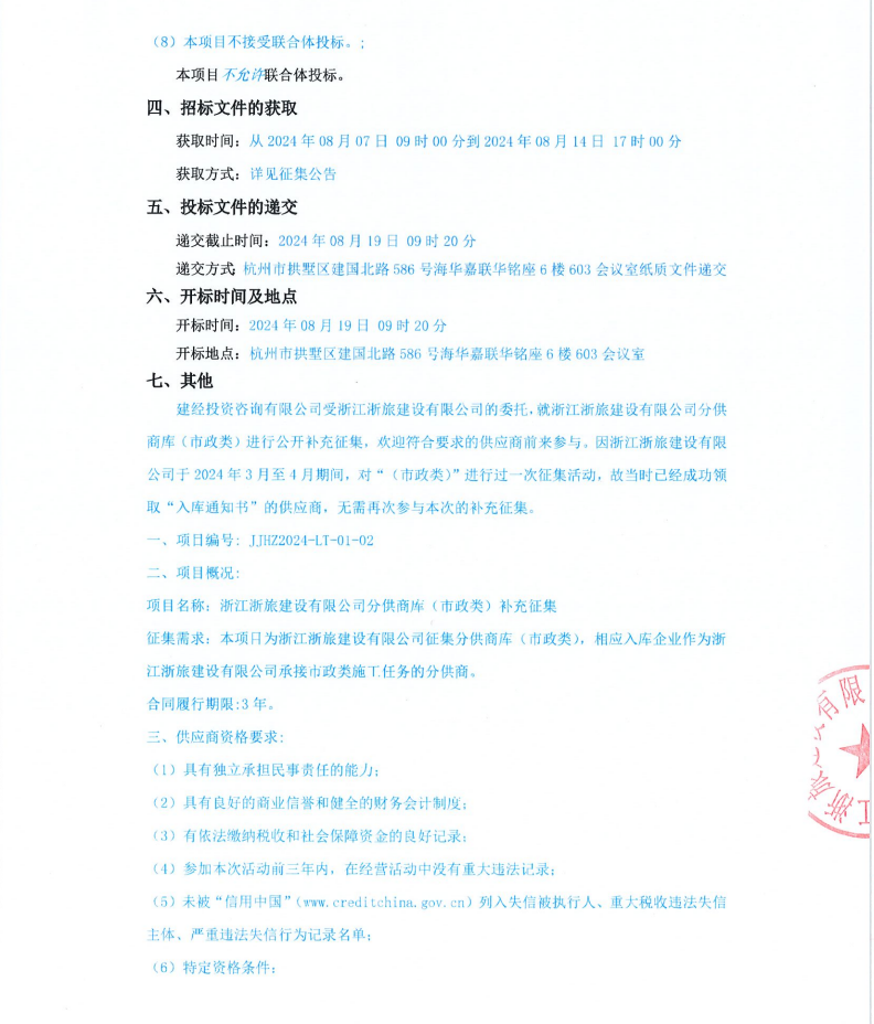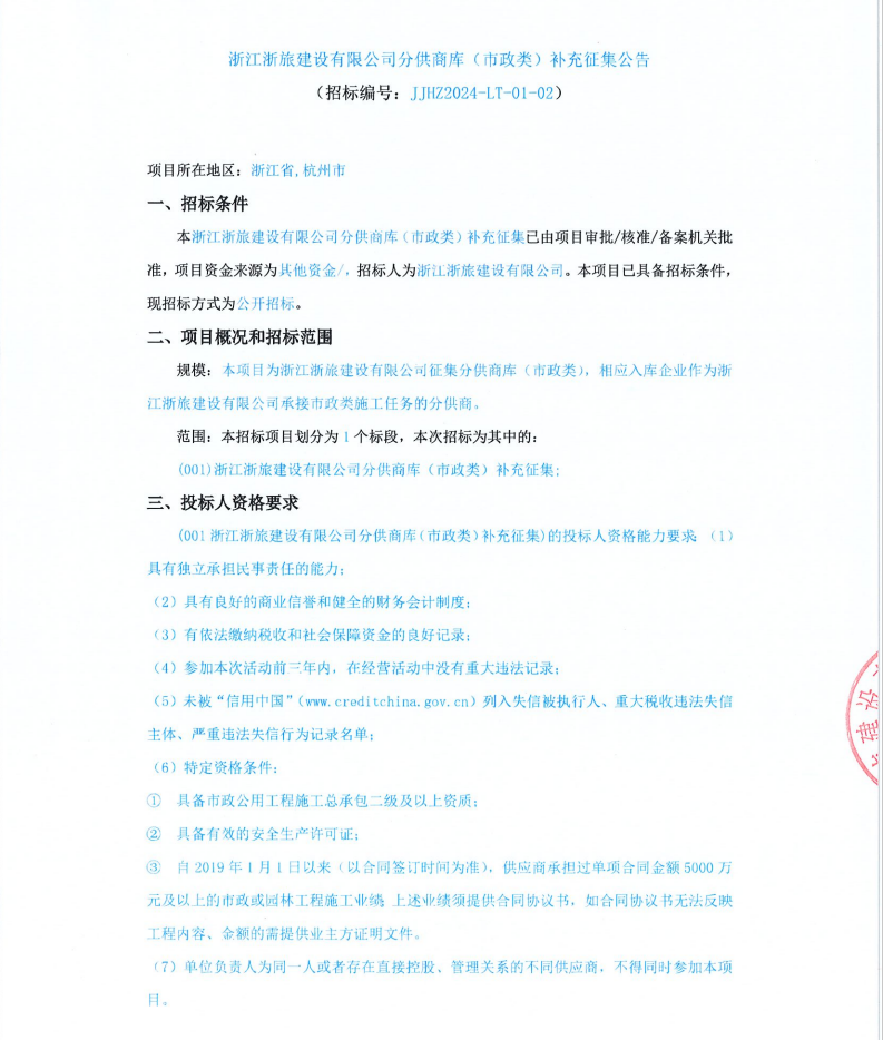 浙江浙旅建設有限公司分供商庫(市政類)補充征集公告