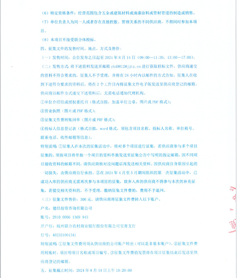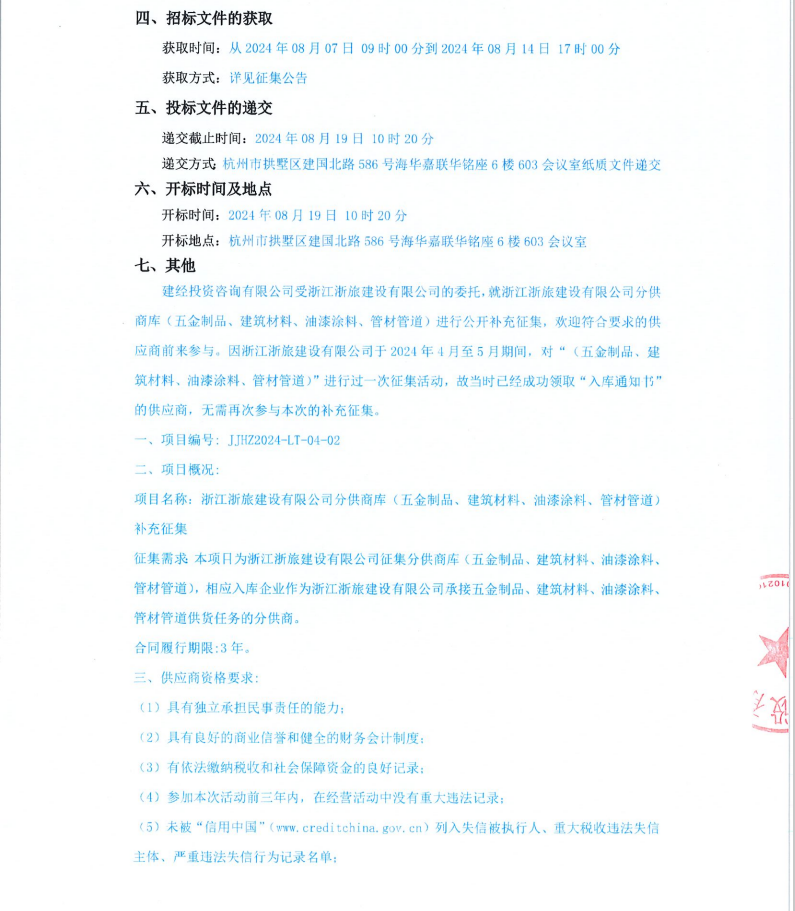 浙江浙旅建設(shè)有限公司分供商庫(五金制品、建筑材料、油漆涂料、管材管道)補充征集公告